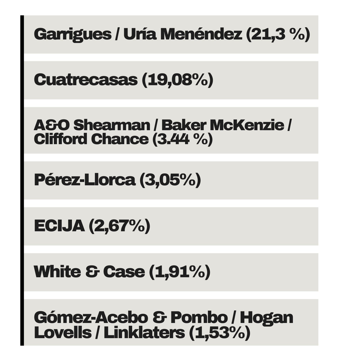 Cuatrecasas (19,08%) mantiene un nivel muy próximo al liderazgo, confirmando el estatus del “tridente” de firmas españolas con mayor reconocimiento.